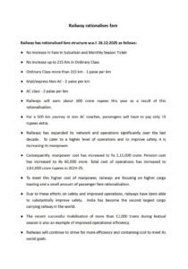 26 दिसंबर से लागू होने वाली नई दरों का असर खासतौर पर लंबी दूरी की यात्राओं पर पड़ेगा। साधारण श्रेणी में 215 किलोमीटर तक की यात्रा पर कोई अतिरिक्त शुल्क नहीं लिया जाएगा। हालांकि, इससे अधिक दूरी के लिए प्रति किलोमीटर 1 पैसा ज्यादा देना होगा। मेल-एक्सप्रेस और एसी श्रेणी की ट्रेनों में यह बढ़ोतरी प्रति किलोमीटर 2 पैसे होगी।
